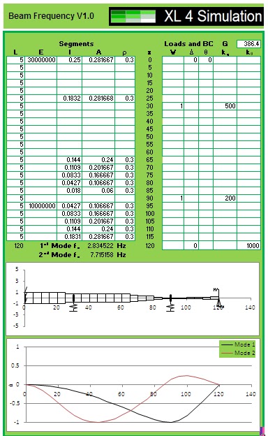 2. A VBA macro option is available on the worksheet that will "optimize" the beam configuration given a user list of available beam sections defined by area moment area of inertia and corresponding section moduli (top and bottom). The optimizer will find the combination of given beam sections optimized to the user defined maximum stress using the smallest sections. The ideal optimum is where all the beam segments are at the maximum allowable stress which will usually correspond to the lowest weight and many times the lowest cost. The algorithm will consider the sections given by the user and will not become trapped in a local minimum.