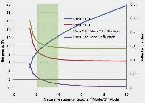 The take ways from this simple study are: 1) For 2 DOF system keeping the 2 modes separated by a frequency ratio of at least 2 (an octave) or more would be desirable from an acceleration response prospective. A frequency ratio greater than 4 appears to offer diminishing returns. 2) Isolating the box is preferred over isolating the circuit board assuming no other considerations make this undesirable like available sway space for the box which increases as the isolation frequency drops.